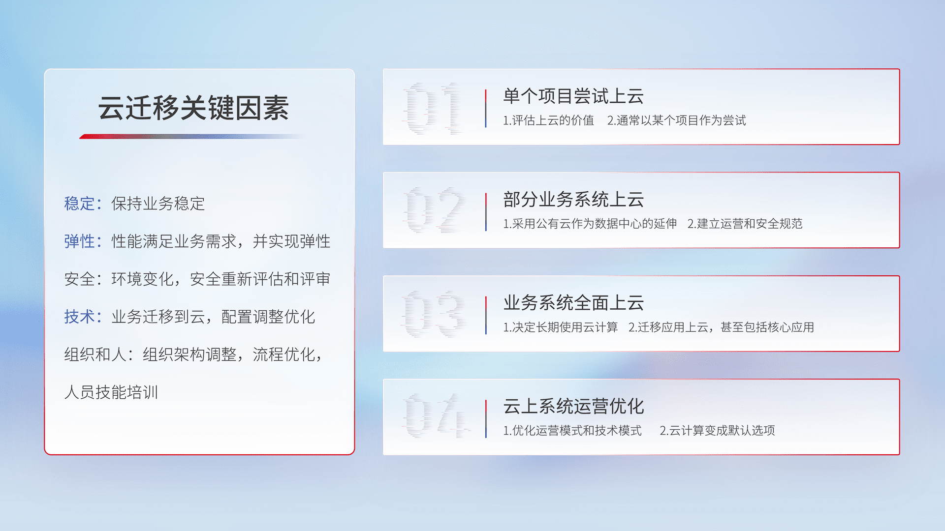 结合实际业务,,,从规划设计、、云平台选型、、、、云原生改造、、、、数据迁移、、、集成交付,,迁移全过程为客户识别最佳上云路径,,做好风险识别管理,,,设计网络架构、、、身份权限、、安全审计合规、、操作审计、、、日志审计、、监控告警策略、、多站点容灾设计等,,对云上基础设施进行整体规划,,提升IT治理水平,,以满足弹性、、高可用、、、、高性能的需求。。。